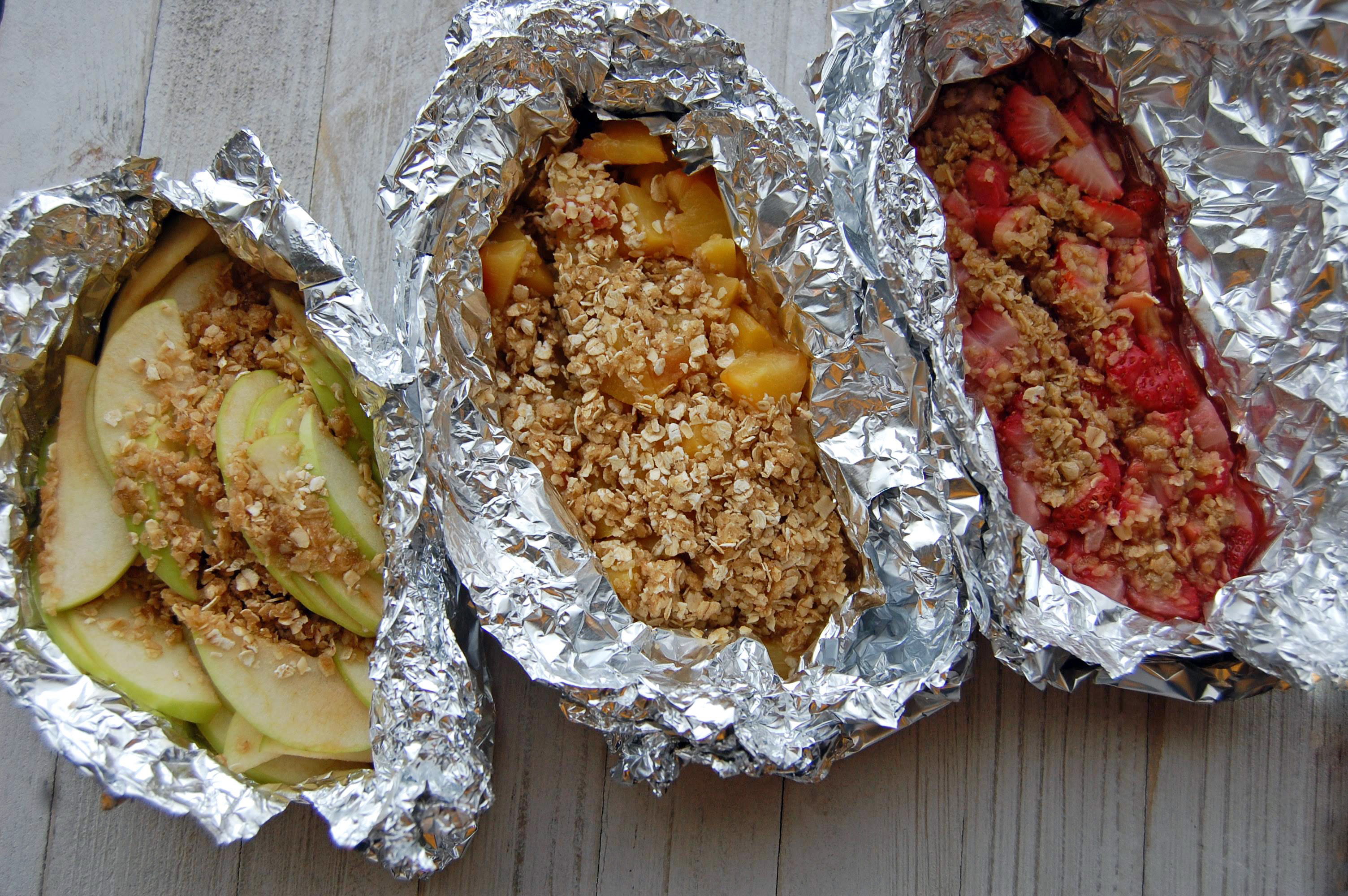 Preheat grill or oven to 350º F. Combine oats, brown sugar and butter in a bowl until crumbly. Cut fruit and place on 12-inch by 12-inch foil sheet. Top with crumble mixture. Fold foil to create packet ensuring all sides are sealed. Grill for 15 minutes or until fruit is desired tenderness.