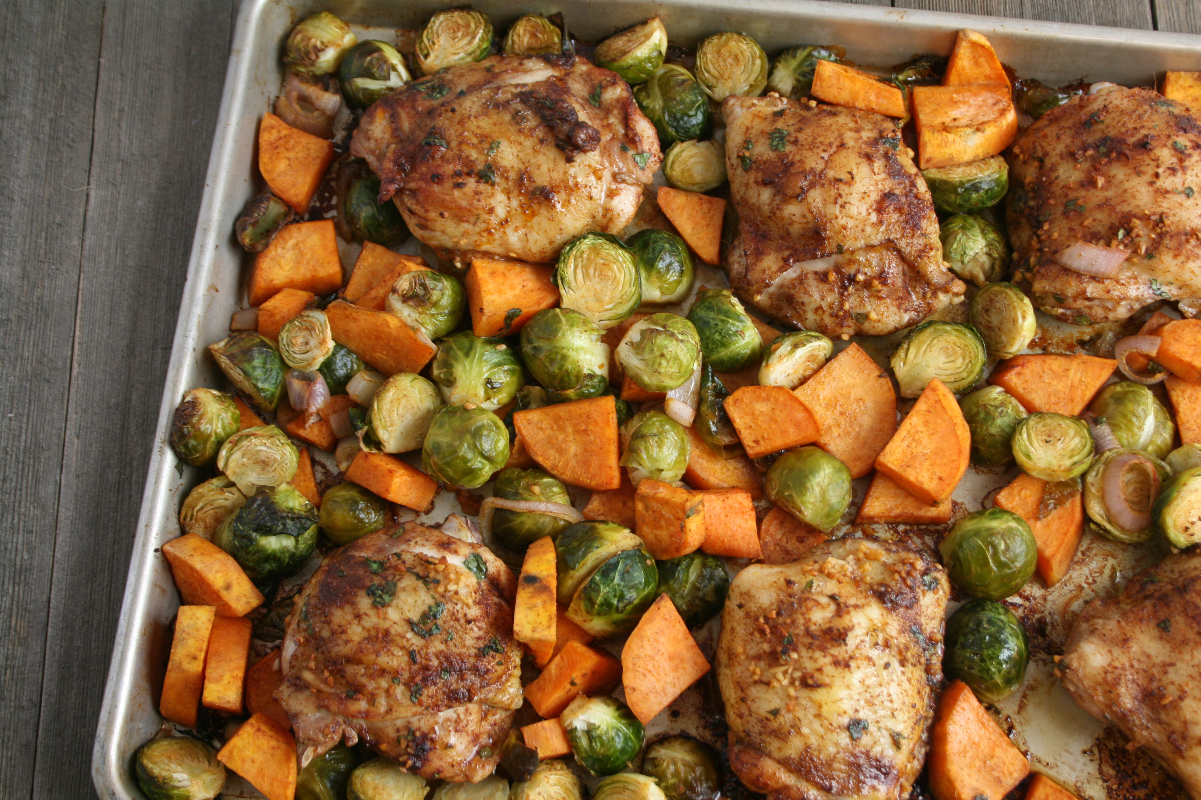 Preheat the oven to 425 F. Sprinkle chicken lightly with salt on both sides and set aside. Place the Brussels sprouts, potatoes and shallots on a large sheet pan. Season the vegetables lightly with salt and drizzle olive oil, then toss the vegetables to mix. In a small bowl, mix the spices. Sprinkle 1 tablespoon of the spice mixture on top of the veggies. To the remaining spice mixture, add 2 teaspoons garlic, 3 tablespoons olive oil and 1 tablespoon lemon juice. Stir into a paste. Brush both sides of the chicken and under the skin with this paste. Add chicken to the pan, and sprinkle remaining minced garlic on top of the chicken and vegetables. Roast for about 35 minutes, or until the chicken reaches internal temperature of 165 F and the vegetables are tender.