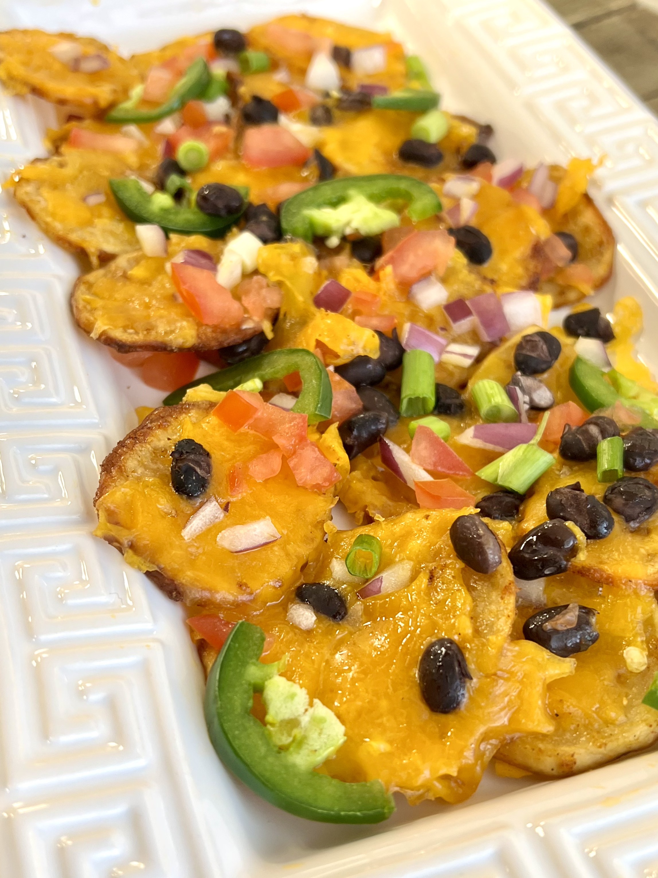 potato rounds and bake for another 20 minutes. Add beans and cheese and cook for an additional 5 minutes or until the cheese is melted. Add the rest of the toppings. If desired, serve with salsa, guacamole and/or sour cream.