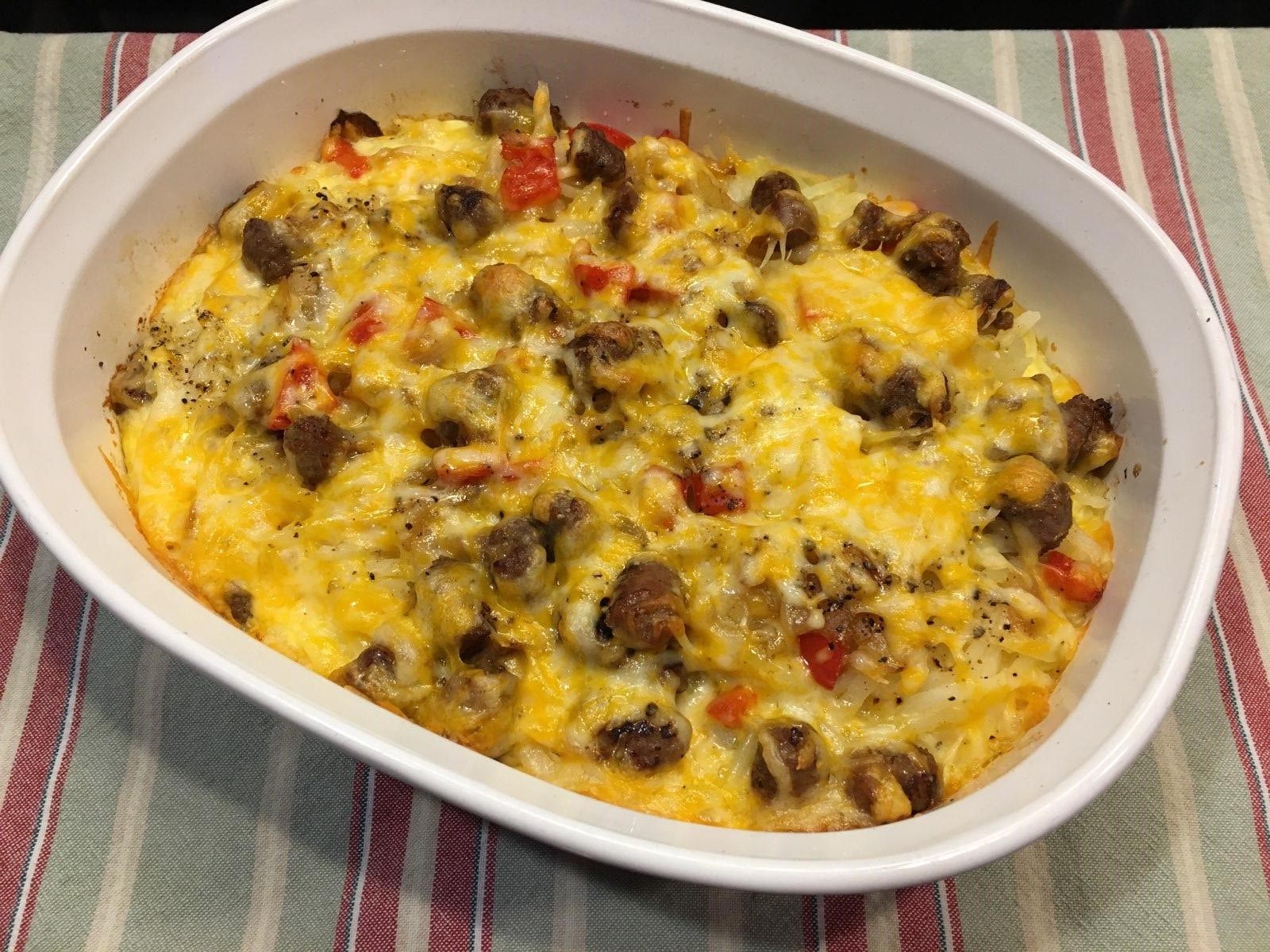 Top the potatoes with half of the sausage, onion and pepper mixture. Top with 1 cup of shredded cheese. Repeat layers. Sprinkle the top with remaining cheese. Whisk together eggs, milk and seasonings. Pour egg mixture over the layers and swirl gently to penetrate layers. Bake for 30 to 35 minutes or until eggs are set.