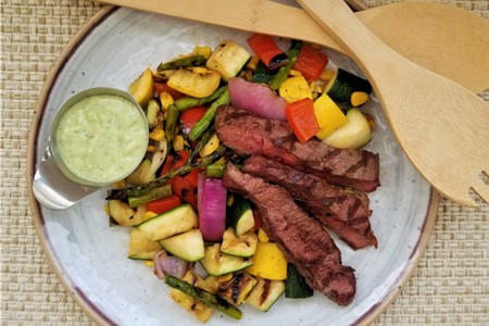 Assemble a mix of vegetables in a bowl and top with dressing. Finish by adding steak to the top of the salad
