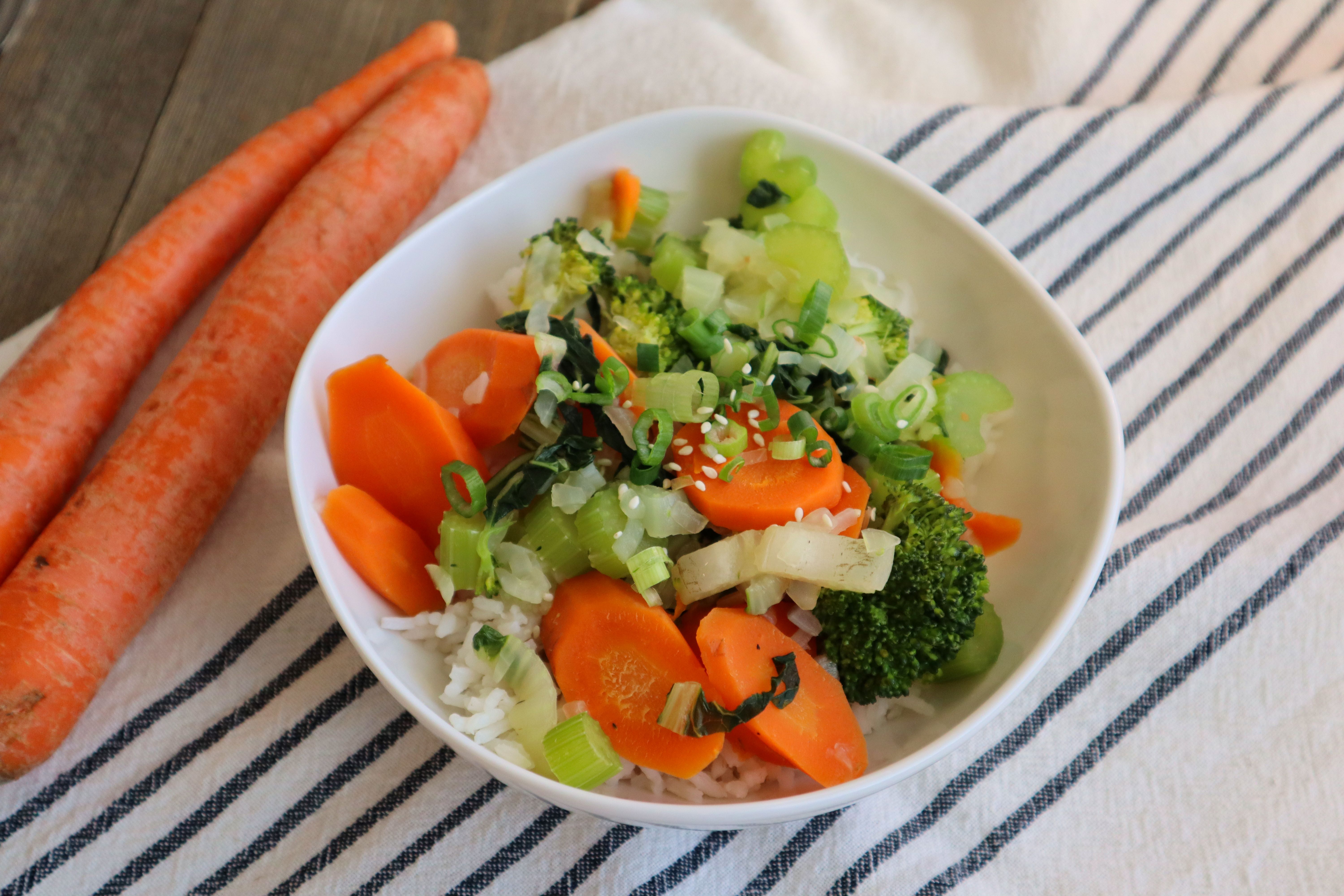 Heat oil in a frying pan or wok over medium-high heat. Add prepared carrots, broccoli and garlic to the frying pan. Stir constantly for 3 to 5 minutes. Add curry powder (optional). Add celery, Chinese cabbage, onion and ginger. Cook for an additional 2 minutes. Vegetables should be firm when done. Serve over rice. Garnish with green onion and sesame seeds (optional). Refrigerate leftovers.