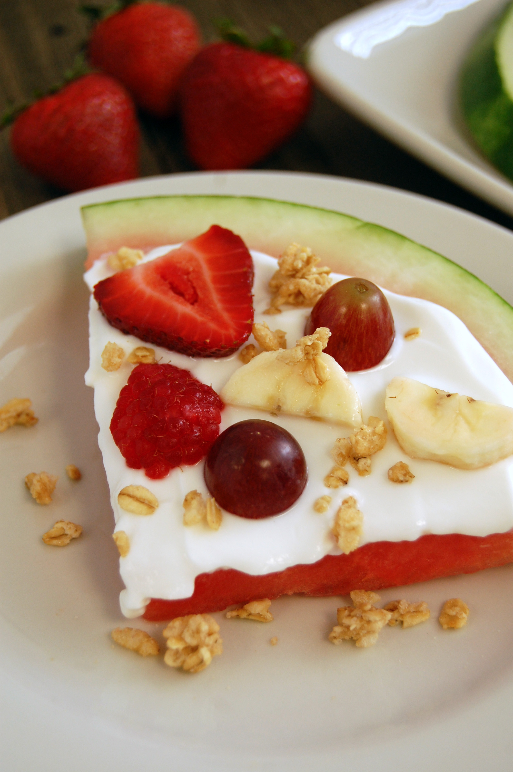 Slice the watermelon into large “coins”. Spread the watermelon coins with 2 tablespoons of vanilla greek yogurt. Slice the strawberries, grapes and bananas. Place the sliced fruits on top of the greek yogurt. Top with 2 tablespoons granola. Slice the finished “pizza” into quarter slices, serve and enjoy.