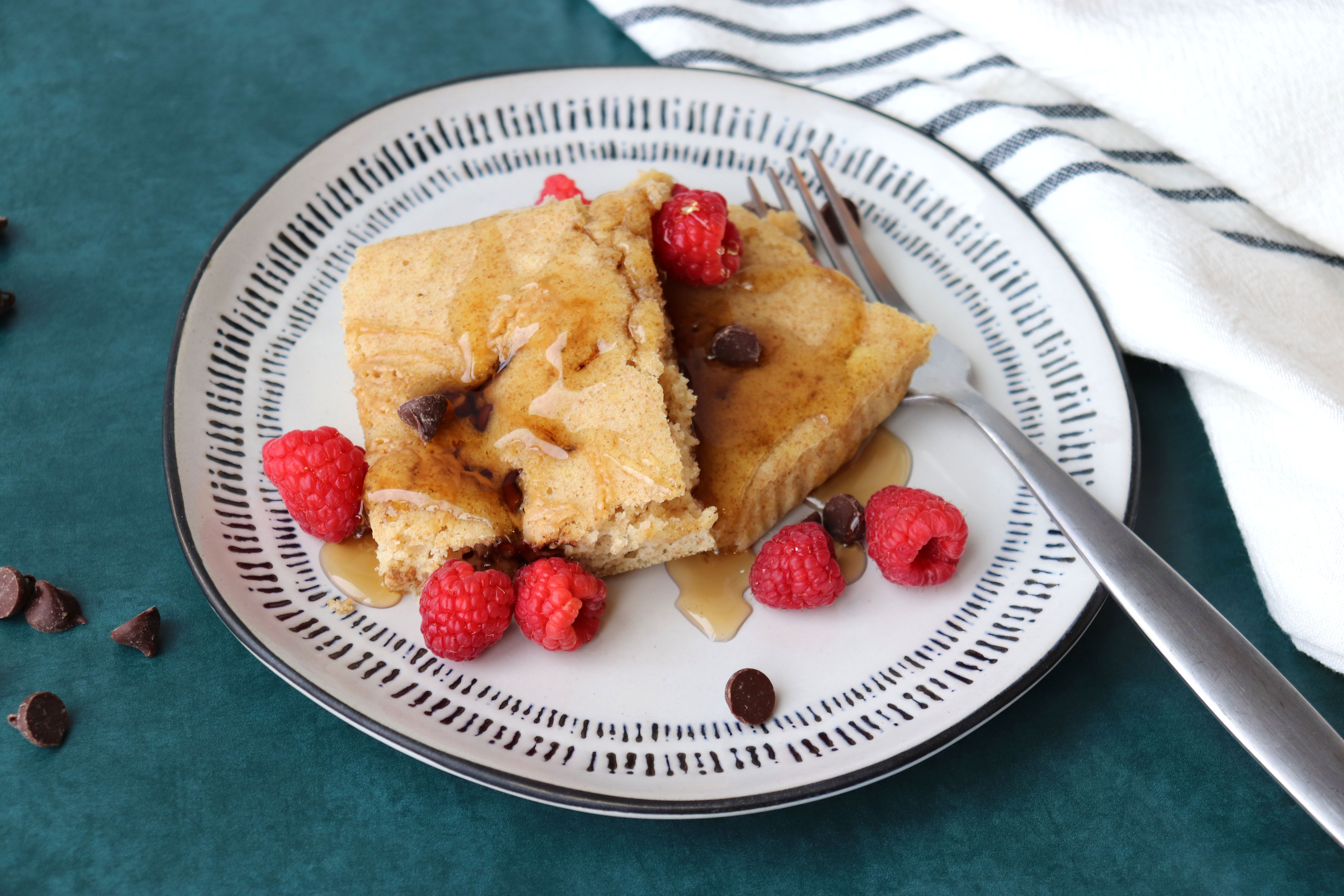 Bake for 15 minutes. Pancake should be golden brown and a toothpick inserted in the center comes out clean. Cut with a pizza cutter and serve.