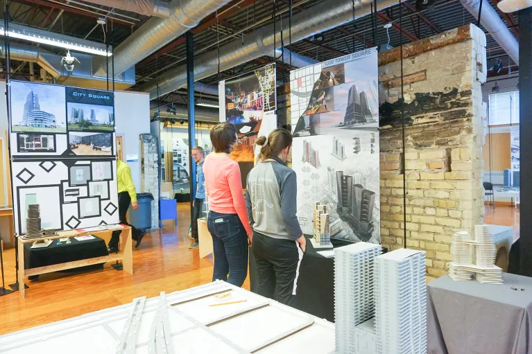 The Fifth floor of Renaissance Hall is designed as a space for large presentations as well as a gallery for studio sections to display their projects, such as the capstone high rise project and the 5th year thesis project.