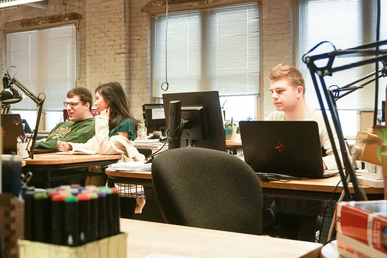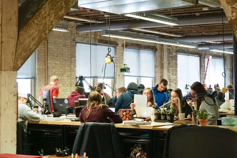 Studios offer an exciting experience for architectural students to work in a collaborative environment. They are equipped with individual desks that students can personalize to create their own unique learning experience. The studio environment is a space designed for all teaching techniques from one-on-one conversations with students to large team projects.