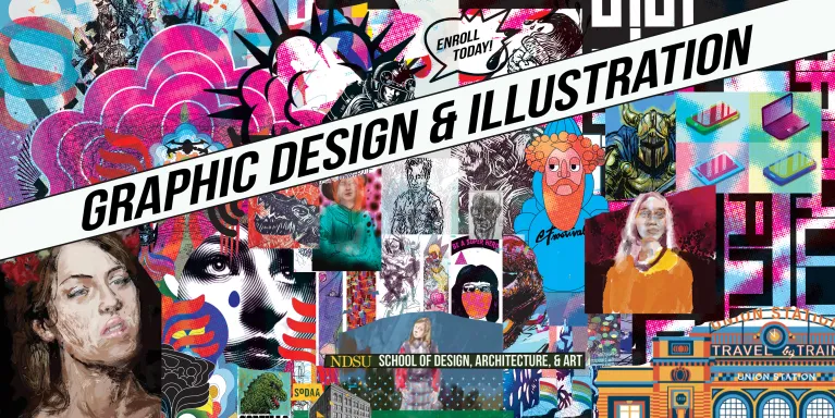 The School of Design, Architecture, and Art is home to a thriving design community housed in the multi-million dollar, state of the art Renaissance Hall. Graphic Design offers undergraduate majors limitless opportunities to collaborate within and beyond the graphic design discipline. Internship opportunities in the Fargo-Moorhead professional design community, participation in the American Advertising Federation-North Dakota ADDY Awards, and cross-disciplinary mentorship with Visual Arts, Advertising, Interior Design, Apparel, Retail Merchandising & Design (ARMD) and Architecture & Landscape Architecture faculty and students all form a thriving creative environment that allows students opportunities to engage in meaningful dialogue about graphic communication within a design community.
