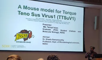 Tariqul Islam gave an oral presentation at the American Society for Microbiology (ASM) North Central Branch meeting in Iowa. The title of his talk was “A mouse model for Torque teno sus virus 1 (TTSuV1)”. Tariqul is mentored by Dr. Sheela Ramamoorthy (Microbiological Sciences).