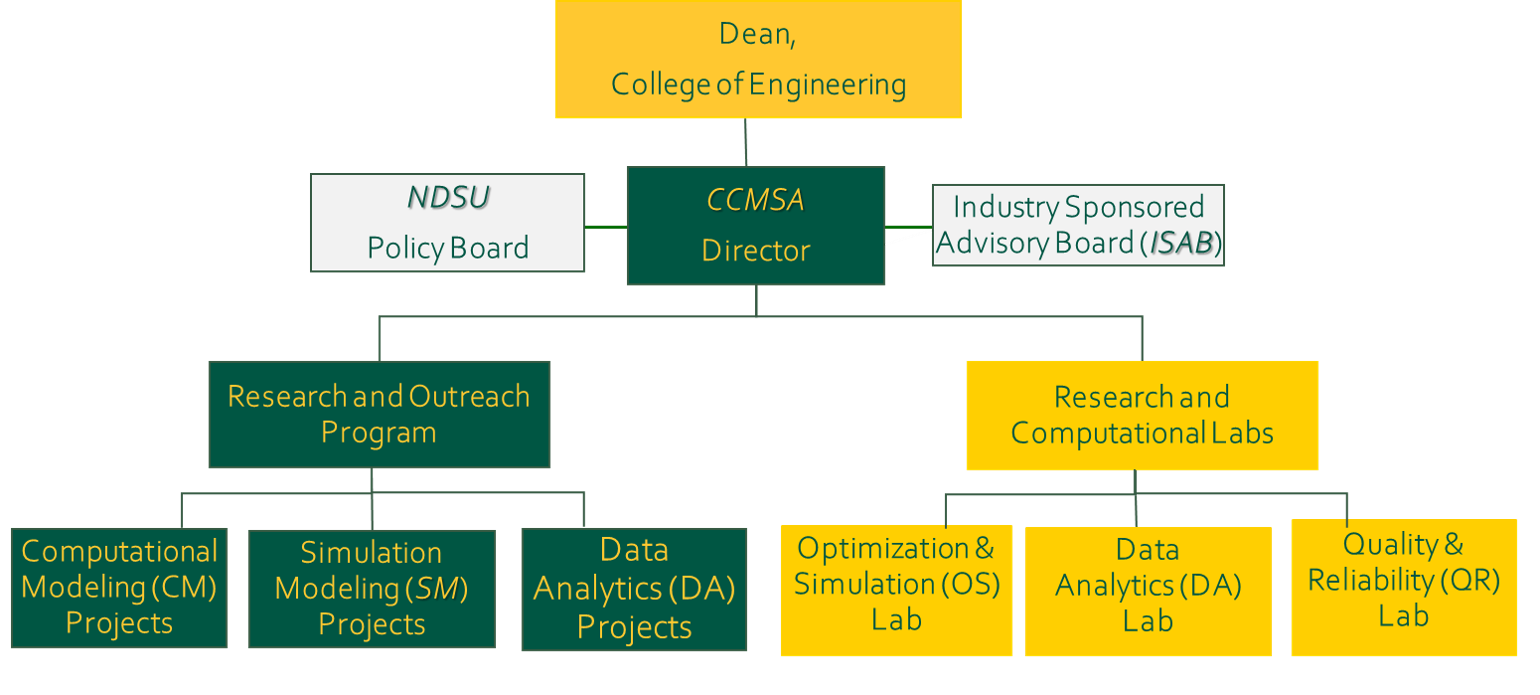 Officially established in 2014, CCMSA (formerly CQRME) is operating under the North Dakota State University (NDSU) and supported by external industries. The center has a Director who reports to the Dean College of Engineering. The Center has a policy board that ensures that the center activities are consistent with academic policies and procedures of NDSU. The industry sponsor advisory board (ISAB) consists of voting members from each participating company with full membership. The ISAB advises the Director on setting goals and future research direction, setting research priorities, and making recommendation on research projects to be funded. The organization chart of the CCMSA is shown below.