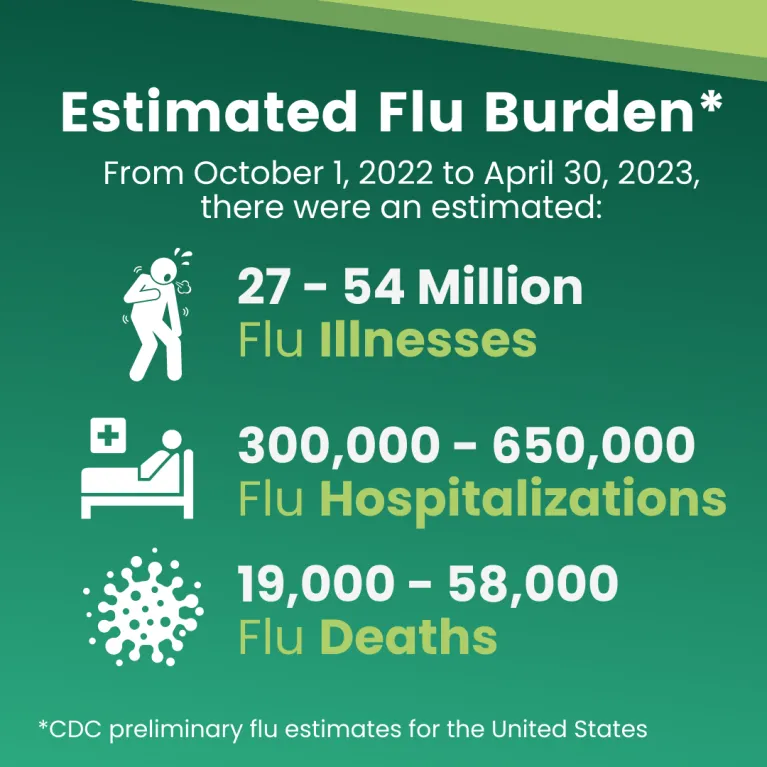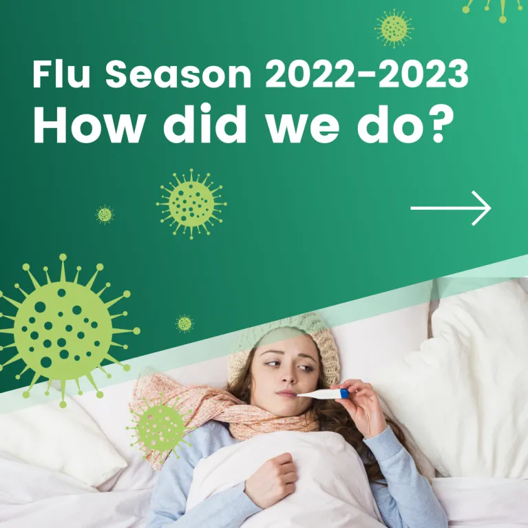 Influenza (also commonly called the flu) is an illness caused by the influenza virus, which can cause respiratory illness in humans and in other animals. This virus is spread from person to person via droplets. Like RSV, influenza transmission increases seasonally—though it can vary from year to year, Flu season begins in the fall, and usually cases peak from December to February. Although most people recover within two weeks, Influenza can cause mild to severe complications such as sinus infections, pneumonia, and even death. Those at highest risk for complications are adults over 65, pregnant people, children under 2, immunocompromised people, and people with chronic diseases such as heart conditions or asthma.