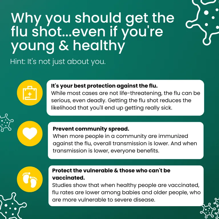 Studies show that communities with high flu shot uptake have less community transmission. So, even if you're young and healthy, it's still a good idea to get the flu shot every year.