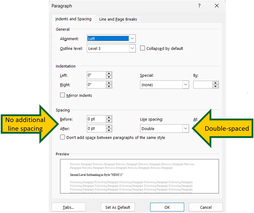 Another common issue is extraneous line spacing above the heading; ensure the heading is formatted to be double-spaced with 0 pts of line spacing above and below. See the line spacing section above for examples of these settings.