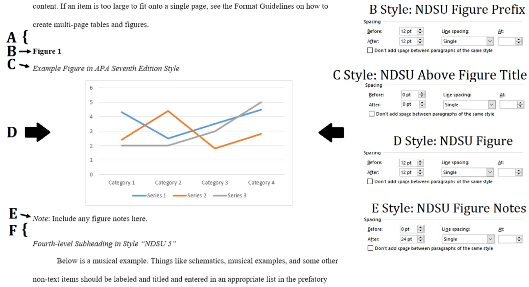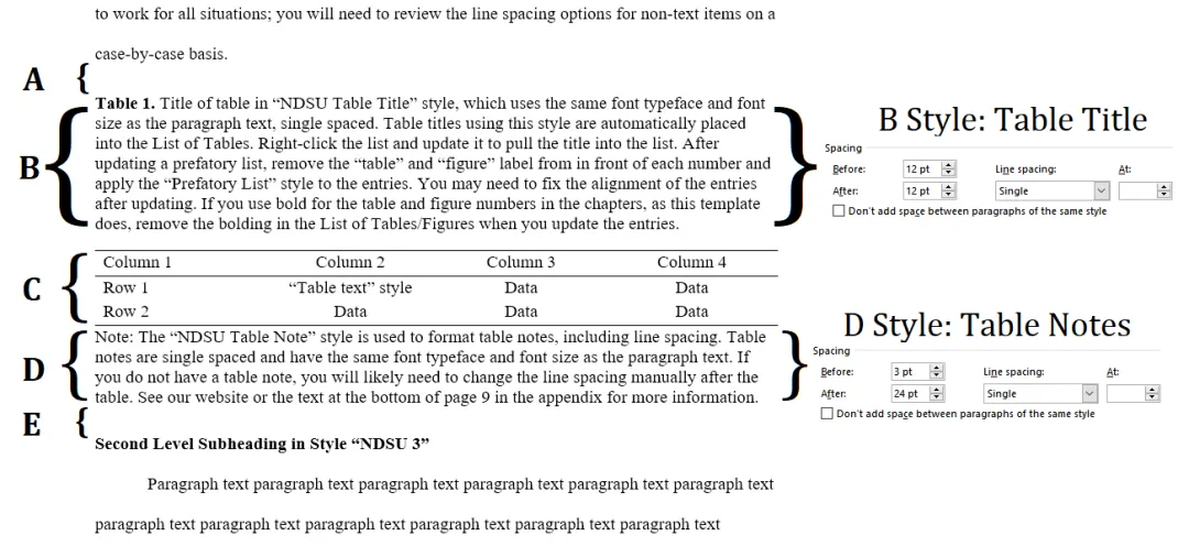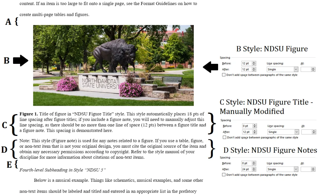 If you are using a template document, we recommend using the Graduate School's default styles (prefixed with "NDSU") to help manage the line spacing around and within tables, figures, schemes, and other non-text items. Using our template's styles for their respective items ensures consistent line spacing above and below items, but these styles will likely require modification because there is no "one-size-fits-all" formula since formatting conventions vary widely across disciplines--for example, if the style manual of your discipline places figure titles above the figure, you will need to accomodate the figure & figure title Word styles to accommodate this.