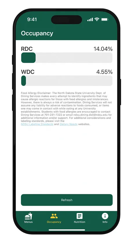 View the Occupancy Tracker or find occupancy information in the NDSU Dining App.