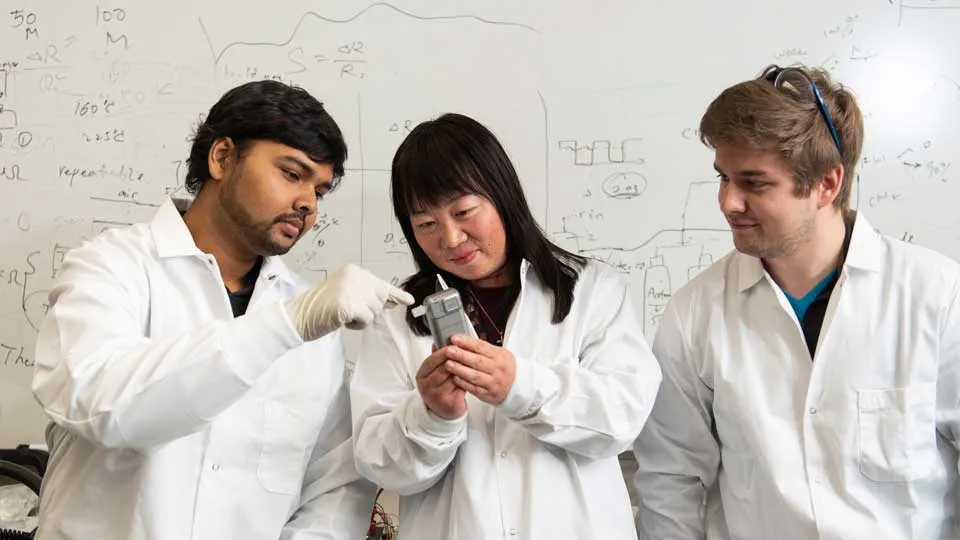 The device is a breath analyzer designed to detect diabetes. NDSU researcher Danling Wang started working on it as a Ph.D. student at the University of Washington. She had gestational diabetes and hated the constant needle pokes required for testing her blood sugar. She knew there had to be a better way.