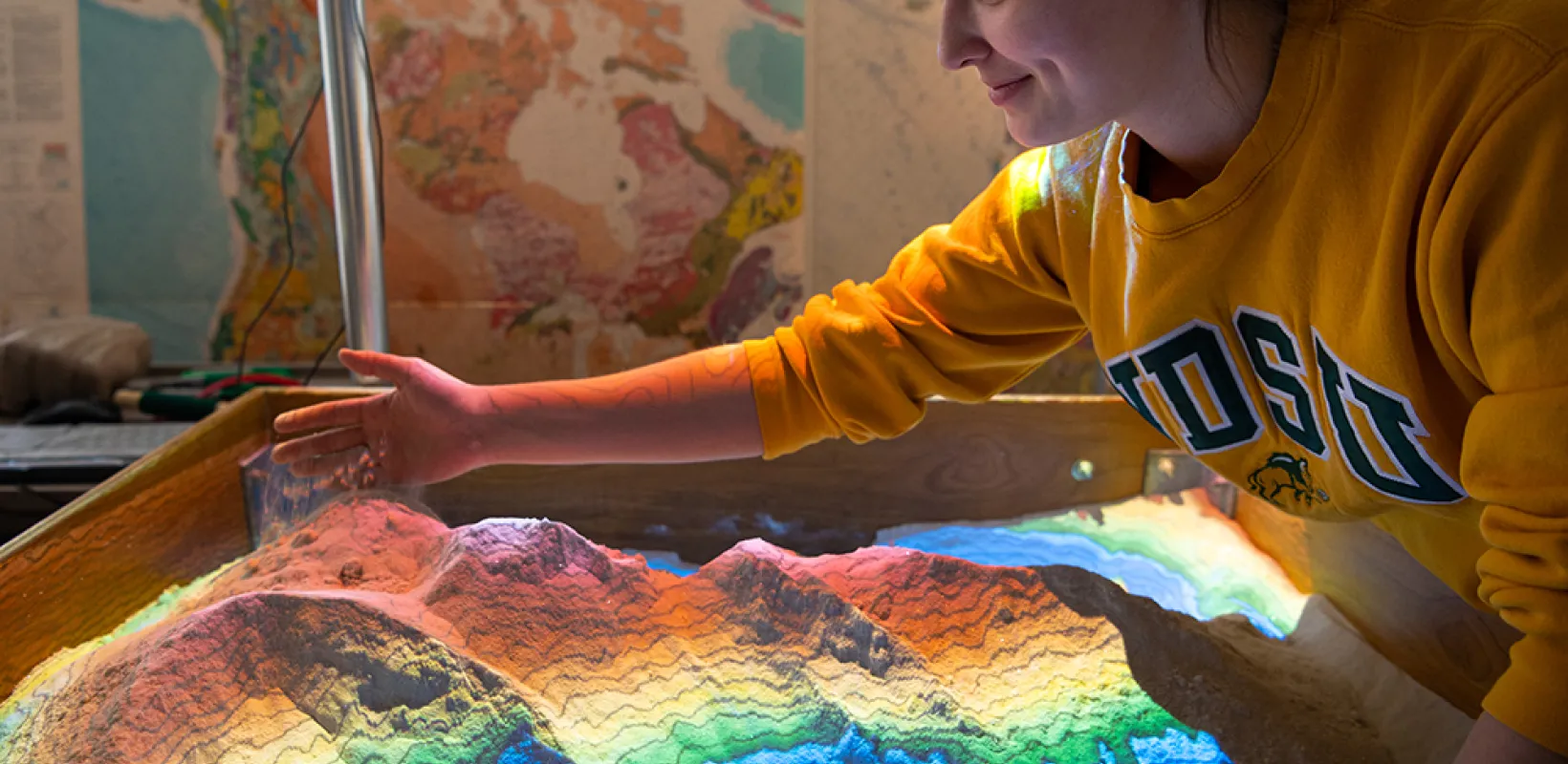 “Being able to play around with sand to manipulate simulated terrain and then see how fluids interact with the landscape are always fun,” said Emily Jackson, a junior geosciences major from Fargo who helps teach the topography map course. “To me, the sandbox is special in what it does for students. By engaging them with a hands-on experience, we're able to make a difficult topic fun and interesting.”