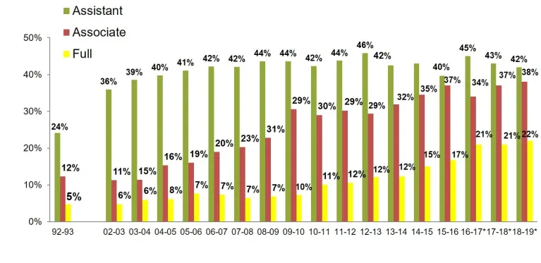 - Increased participation of women faculty in all ranks and leadership roles. Increased the number of associate professors (both genders) to consider promotion.