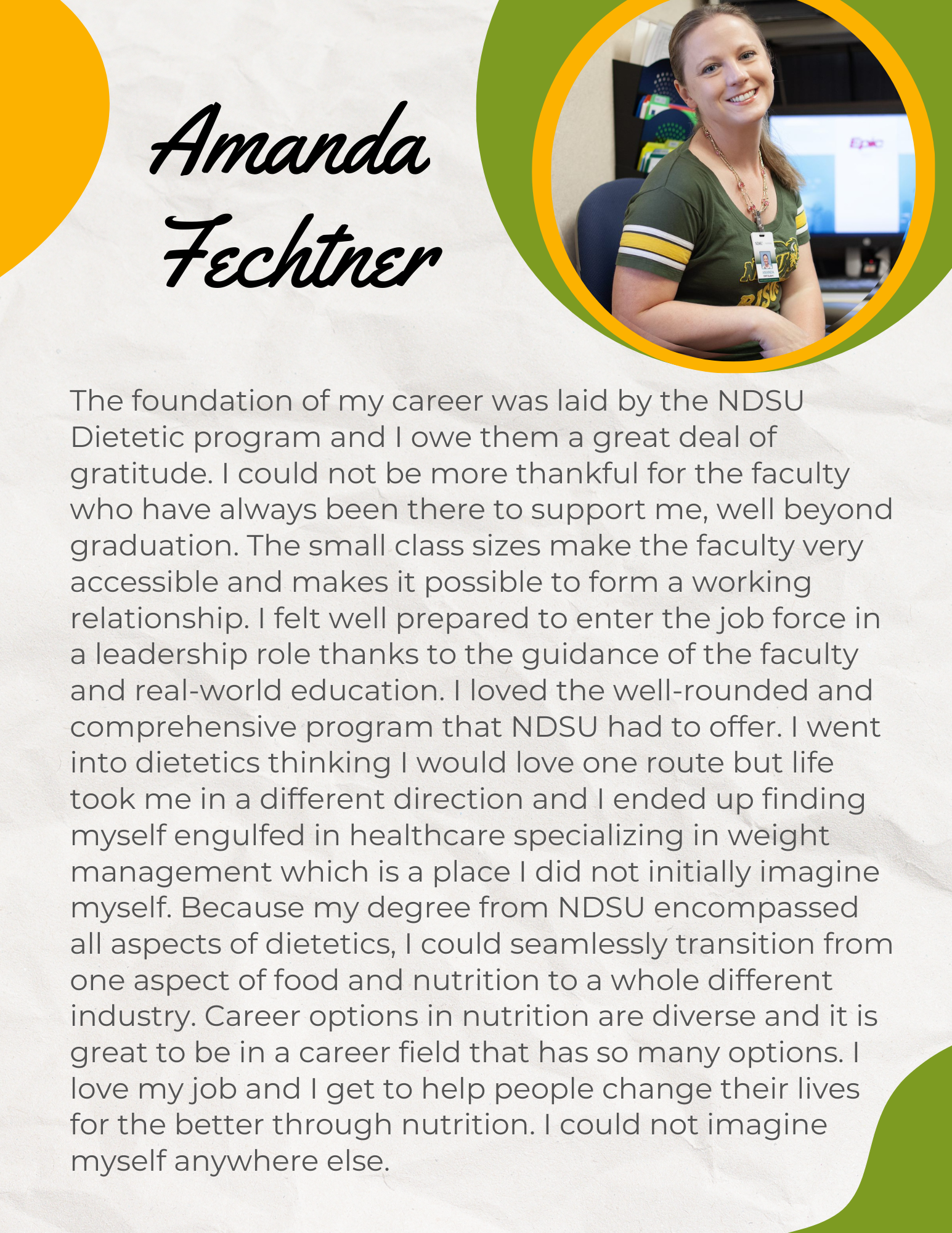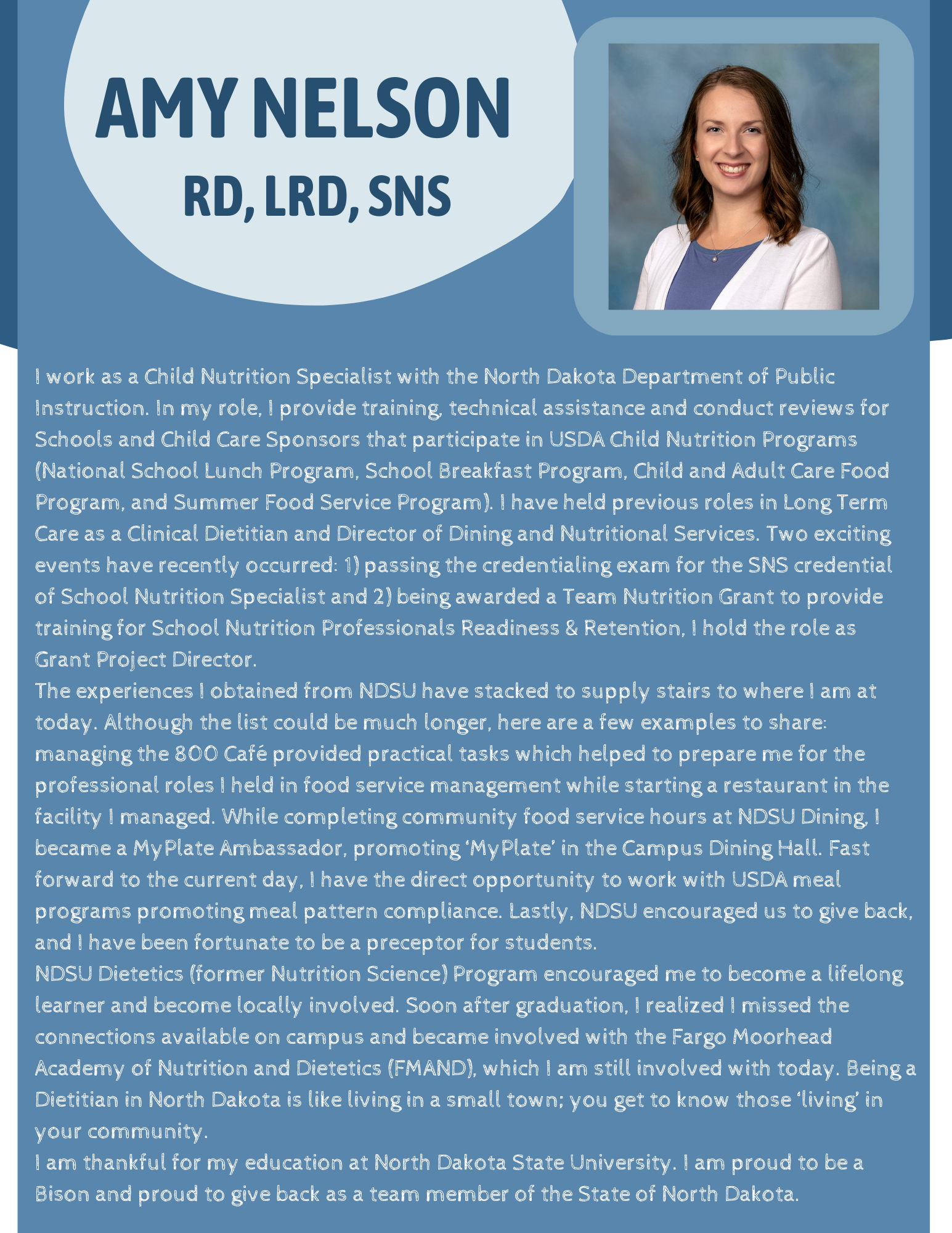 NDSU offers two tracks for those interested in studying nutrition science. The first is an accredited BS/MS Accelerated Coordinated Program in Nutrition Science and Dietetics (CPD) to become a Registered Dietitian Nutritionist (RDN). The second track is a four-year BS in Nutrition Science. This is a non-accredited program that provides students a background in nutrition but also serves as a pathway for advanced degrees in other health professions such as Pre-Physician Assistant, Athletic Trainer, Accelerated (Post-Baccalaureate) BSN to become a licensed Registered Nurse or as a pathway to become a Certified Dietary Manager (CDM).