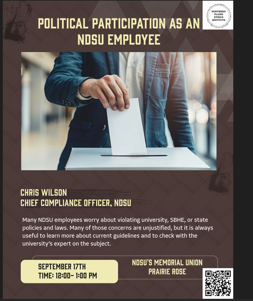 Being part of the political process is a right, but many NDSU employees worry about violating university, SBHE, or state policies and laws. Many of those concerns are unjustified, but it is always useful to learn more about current guidelines and to check with the university’s expert on the subject.