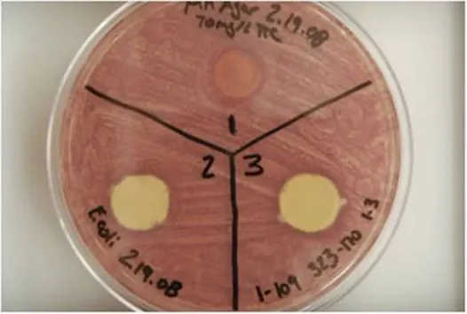 Antimicrobial coatings are prepared on glass or metal discs and placed in contact with nutrient agar plates seeded with a lawn of the appropriate microorganism. The nutrient agar contains a respiratory indicator dye (TTC), which is converted from a colorless to red compound by viable microbial cells, to visualize microbial growth on the coating surfaces. Coatings that exhibit no growth on the coating surfaces (i.e., absence of red color) and lack a zone of inhibition are determined to be contact active (samples 2 and 3 in image above).