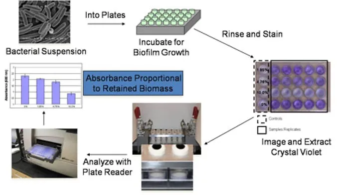 The primary workhorse of the high-throughput screening workflow for antifouling characterization is based on the utilization of marine bacteria. In particular, the marine bacteria employed are allowed to attach and colonize the coating surfaces for the appropriate period of time needed to generate a biofilm (i.e., 24-48 hours). One of the defining characteristics of bacterial biofilm formation is the generation of an extracellular polymeric substance (EPS). The EPS is predominantly composed on polysaccharides and protein and serves as effective matrix to not only adhere bacteria to surfaces or interfaces, but protect them from environmental adversity (i.e., predation, antifouling agents etc.).