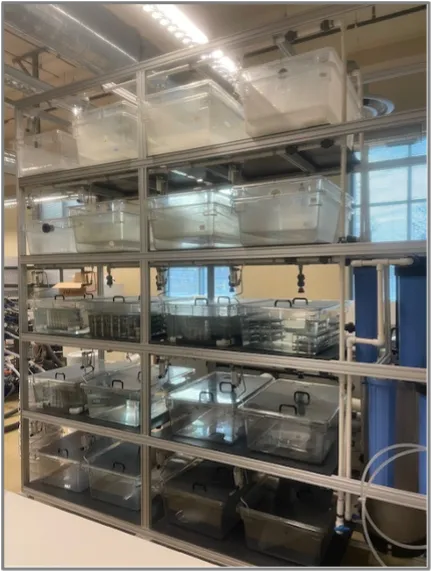 Prior to coating evaluations, coated 24-well plates and panels are immersed in a custom-built, once flow-through water tank system for an appropriate period of time to facilitate removal or “leaching” of toxic impurities (i.e., residual solvent, catalyst, monomers etc.). The system consists of a series of aquarium tanks that are exposed to a continuous flow of municipal water. Each tank is isolated in terms of water flow (i.e. no tank-to-tank recirculation) to eliminate the potential of cross-contamination events.