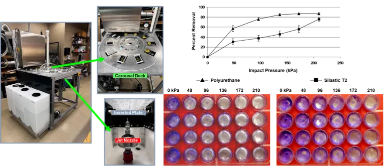 An additional screening assay for biofilm adhesion was adapted from a water-jet methodology commonly used at ocean immersion testing sites to evaluate the adhesion strength of various fouling organisms in the field. An automated and miniaturized version of the water–jet apparatus used in the field was built in-house at NDSU. The system consists of a 10-positon carousel that rotates a series of well plate carriers into proper position for water jet treatments. Well plate carriers are inverted by an actuated ‘flipping’ mechanism over a mobile, spinning nozzle that exposes the coated well bottoms to a pressurized stream of water perpendicular to the coating surface. The duration and pressure of the water-jet are precisely controlled through a customized software program. Coatings prepared in 24-well plates are subjected to water-jet treatments after bacterial incubation to facilitate removal of adherent biofilms. The difference in biomass, before and after water jetting treatments, is determined using the same crystal violet quantification assay used in the characterization of antifouling coatings. Experiments with Halomonas pacifica (right) demonstrated the difference in fouling-release performance observed between a silicone elastomer (Silastic T2) and polyurethane coating, with respect to biofilm adhesion.