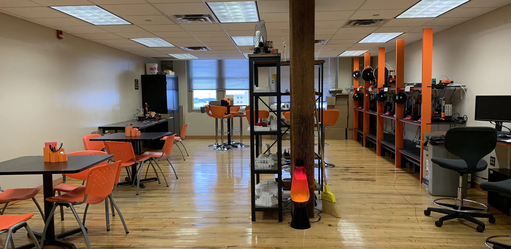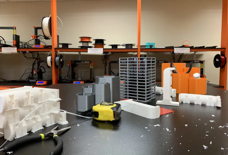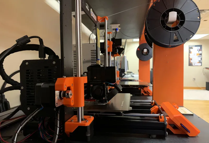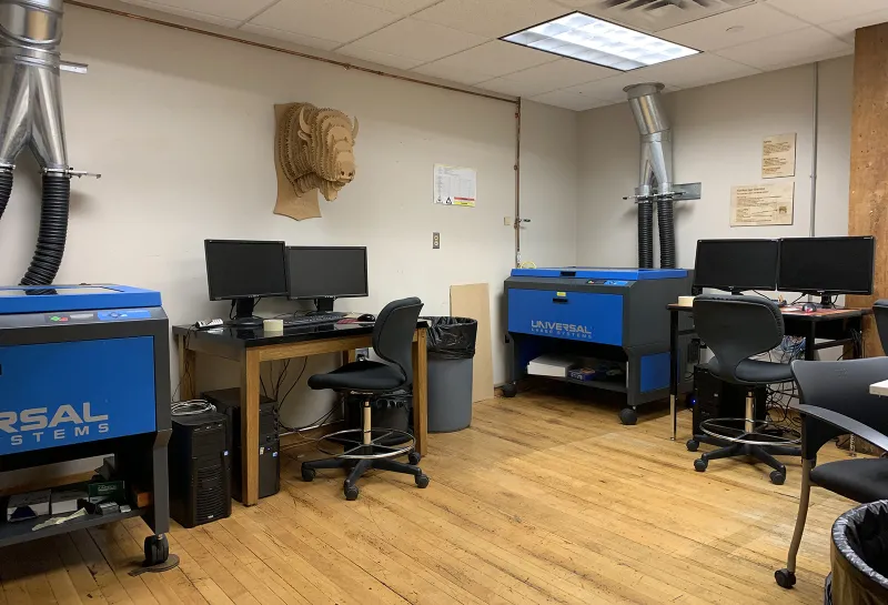 The LA-A-VA lab is an interdisciplinary area for digital creation and fabrication. Use our virtual reality lab to view your project or create 3D models. Our 16 Prusa Mk3S 3D printers allow you to reliably take your digital projects into the real world. For large scale projects and precision artwork, you can use our two Universal Laser Systems laser cutters to cut and etch wood, acrylic, and more! The space is also a great place to relax and collaborate, with space to sit and work and a giant whiteboard wall to elaborate and express yourself!