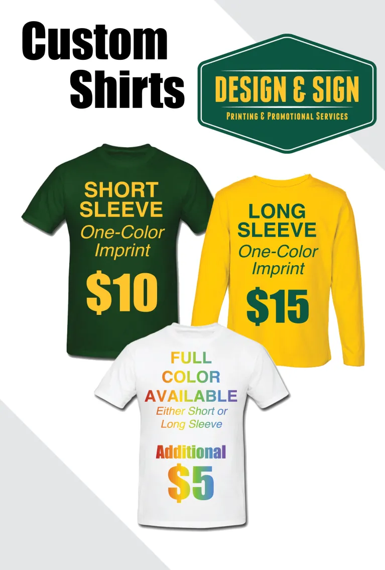 How much is it: For a single-color front or back imprint up to 11"x11", each T-shirt will be $10. To add an imprint onto the other side, add $7 for each shirt. Long sleeve shirts, add $5. Make it full color for $5 more. XXL shirts, add $2, XXXL shirts, add $3.