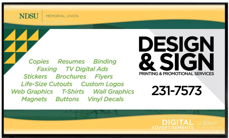 The Digital Displays in the Memorial Union are a great way to advertise your event or program. Display rates are for a 7 day reservation. No pro rating for additional or fewer days. | |