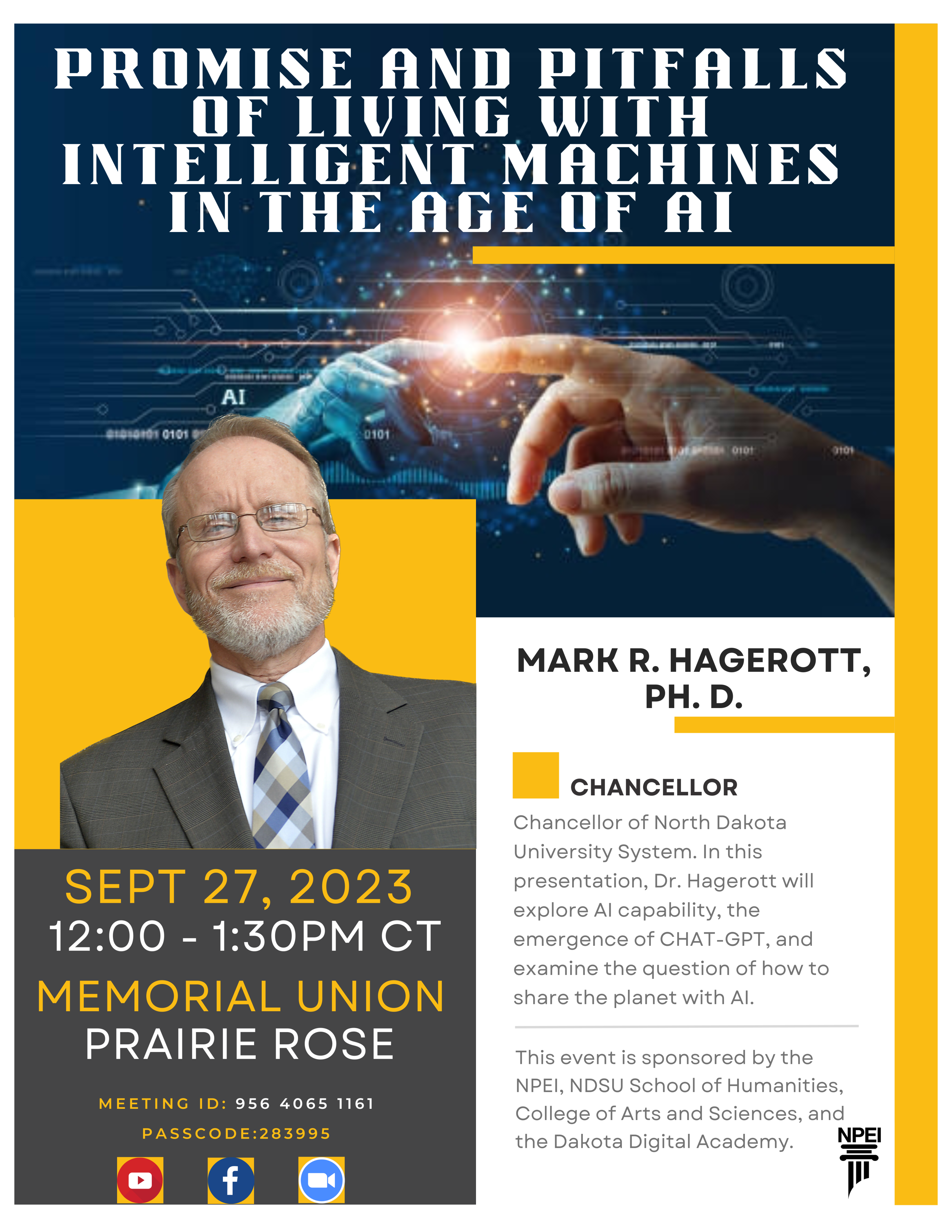 Northern Plains Ethics Institute is scheduled to host an AI and The Humanities seminar featuring North Dakota University System Chancellor Mark R. Hagerott at noon to 1:30 p.m. on Sept. 27, at the Memorial Union Prairie Rose room.