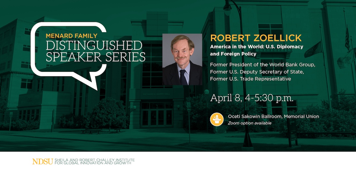 Zoellick’s talk, titled “America in the World: U.S. Diplomacy and Foreign Policy,” will begin at 4 p.m. in the Oceti Sakowin Ballroom at the NDSU Memorial Union.