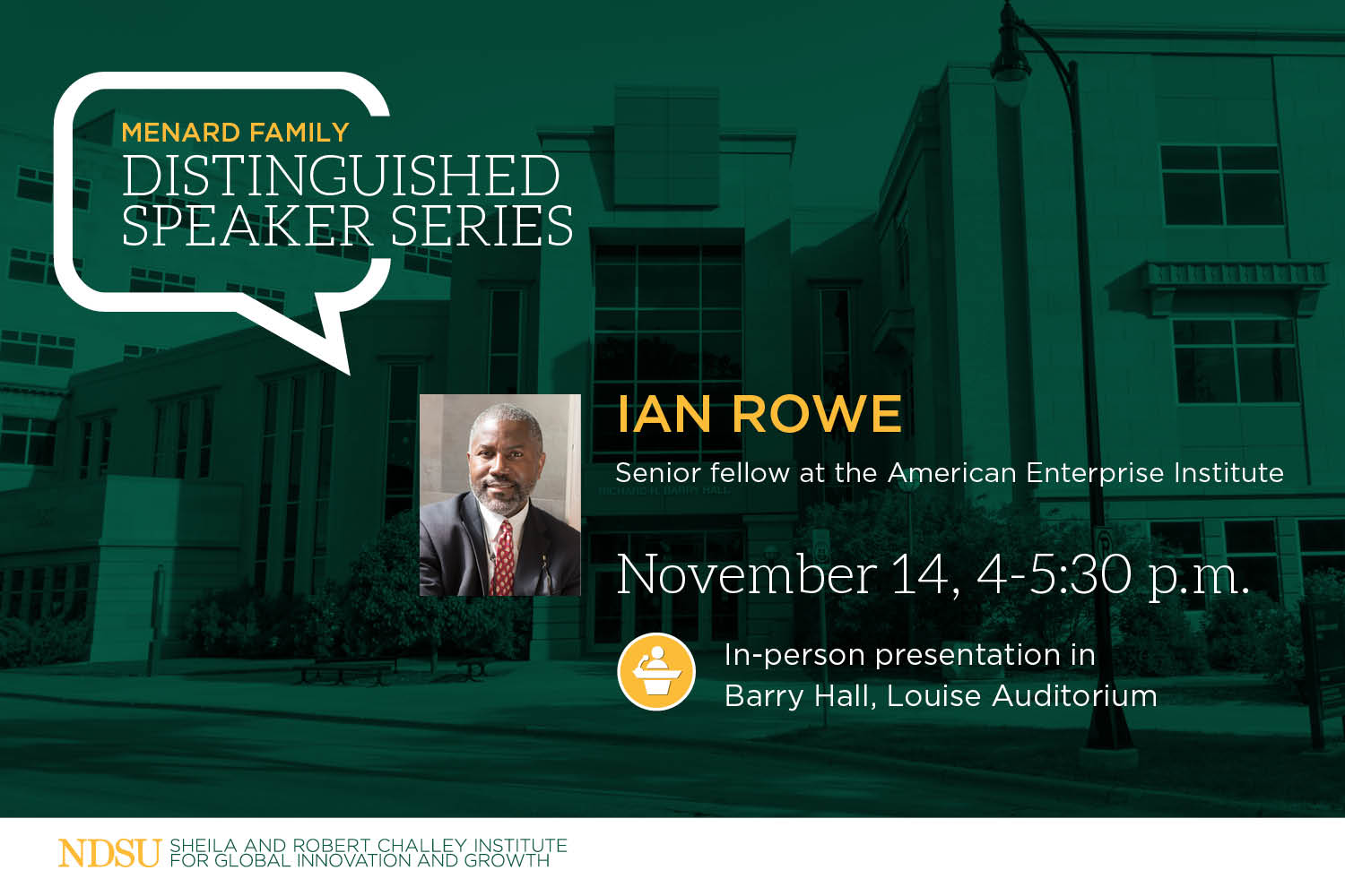 NDSU's Challey Institute invites the public to attend “A Conversation on Agency, Education and Upward Mobility” with Ian Rowe on Tuesday, Nov. 14. The event is free and open to all members of the NDSU community and the public.