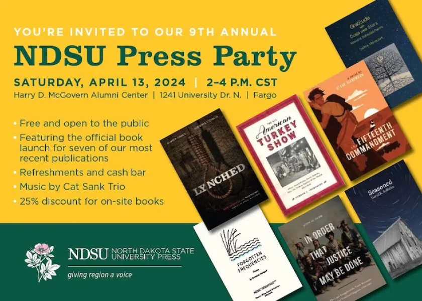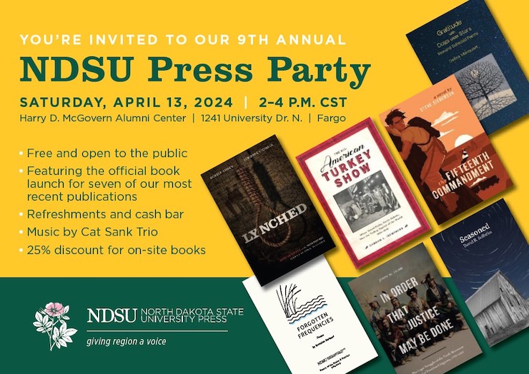 The NDSU Press will launch seven of its most recent book releases during the ninth annual NDSU Press Party, scheduled for Saturday, April 13, from 2 p.m. to 4 p.m. at the Harry D. McGovern Alumni Center, located at 1241 University Drive N., Fargo.