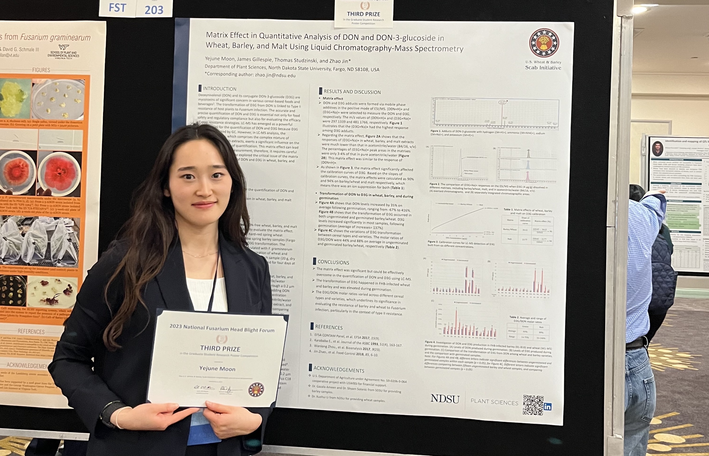 Yejune Moon, an NDSU master’s degree student with Dr. Zhao Jin, won third place at the U.S. Wheat and Barley Scab Initiative’s 2023 National Fusarium Head Blight Forum in Cincinnati, Ohio, in December.