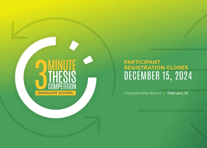 Registration for the 2025 NDSU Three Minute Thesis competition will open on Monday, Oct. 14, and will close on Sunday, Dec. 15.