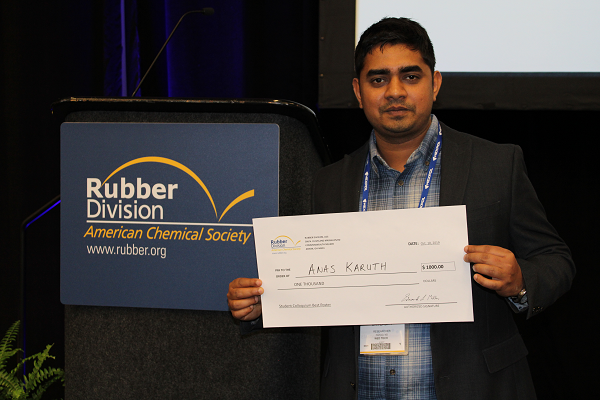 NDSU Department of Coatings and Polymeric Materials doctoral student Anas Karuthedathkuzhiyil excelled in the student research poster competition at 2019 International Elastomer Conference held in Cleveland during October. The conference is part of American Chemical Society’s symposiums, and is organized by the ACS Rubber Division.