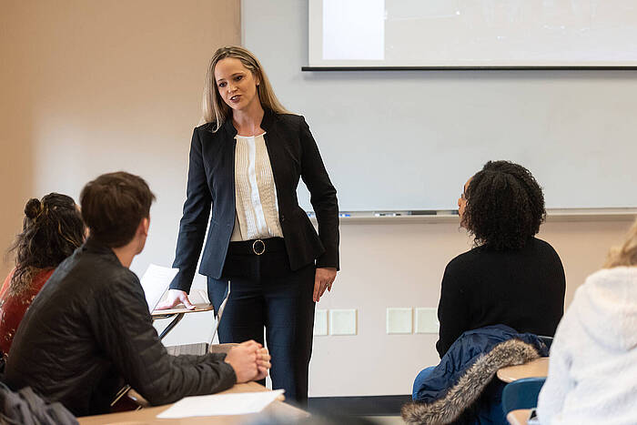 In a photo taken before the pandemic, Ashley Baggett addresses her NDSU students.