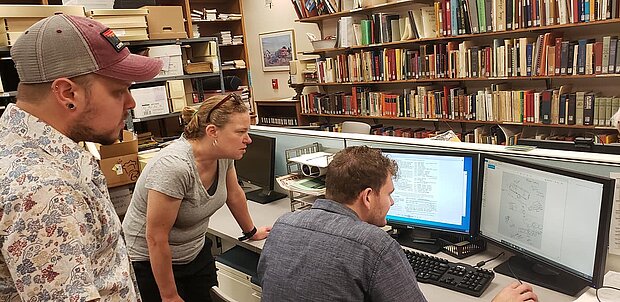 Two visiting researchers work with Jeremy Kopp (right), Germans from Russia Heritage Collection outreach and operations coordinator.