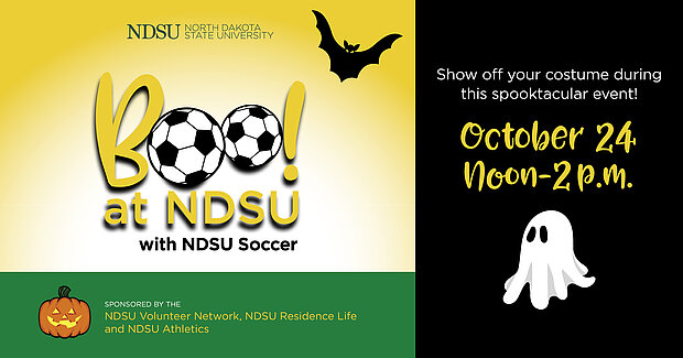 Boo! at NDSU with NDSU Soccer is scheduled for Sunday, Oct. 24, from noon to 2 p.m. at F Lot near the Sanford Health Athletic Complex (1300 17th Ave. N.). The annual holiday event is sponsored by Residence Life, Campus Attractions/Volunteer Network and NDSU Athletics.