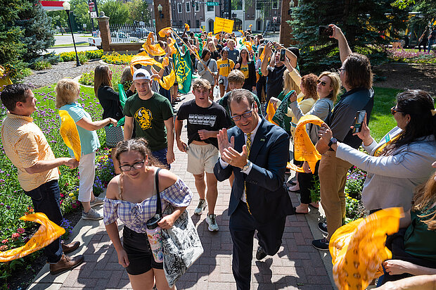 NDSU President David Cook marches through the main gates with some of the 2,500 incoming students.