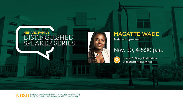The Sheila and Robert Challey Institute for Global Innovation and Growth at NDSU is scheduled to host a presentation by serial entrepreneur Magatte Wade Wednesday, Nov. 30, at 4 p.m. in the Louise S. Barry Auditorium at NDSU’s Richard H. Barry Hall. The talk will be followed by a reception with light hors d’oeuvres at 5:30 p.m.