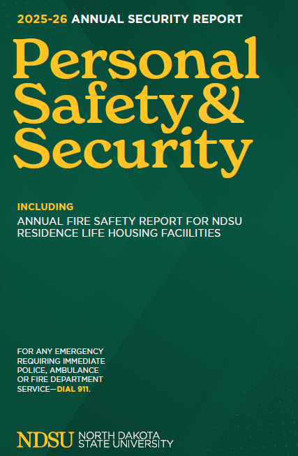 To access the electronic version of the Annual Security Report/Annual Fire Report click on the graphic above. Paper copies of the Annual Security Report/Annual Fire Report can be obtained at the University Police Office located in the Auxiliary Enterprises Building. Email ndsu.police.safety@ndsu.edu or call (701) 231-8998 to request a copy be mailed to you.