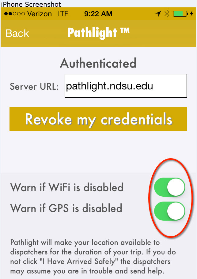 Pathlight also has settings that allow it to provide a warning if Wi-Fi or location services are disabled. To verify they are turned on, tap the Tools icon in Android or the Settings button in iPhone. See the screenshots below: