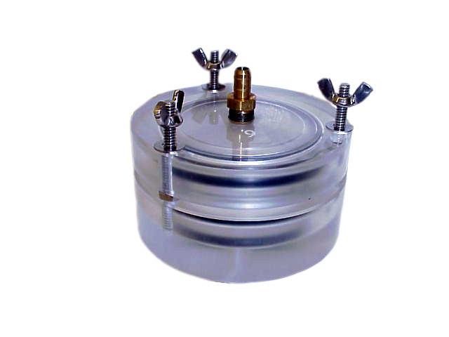 A TEMPE CELL holds an undistubed soil core while a known pressure is applied to force some of the water out of the soil. By doing this at a number of different pressures, we can determine the moisture release properties of a particular soil. These properties indicate how hard a plant has to work to extract the water from the soil. |