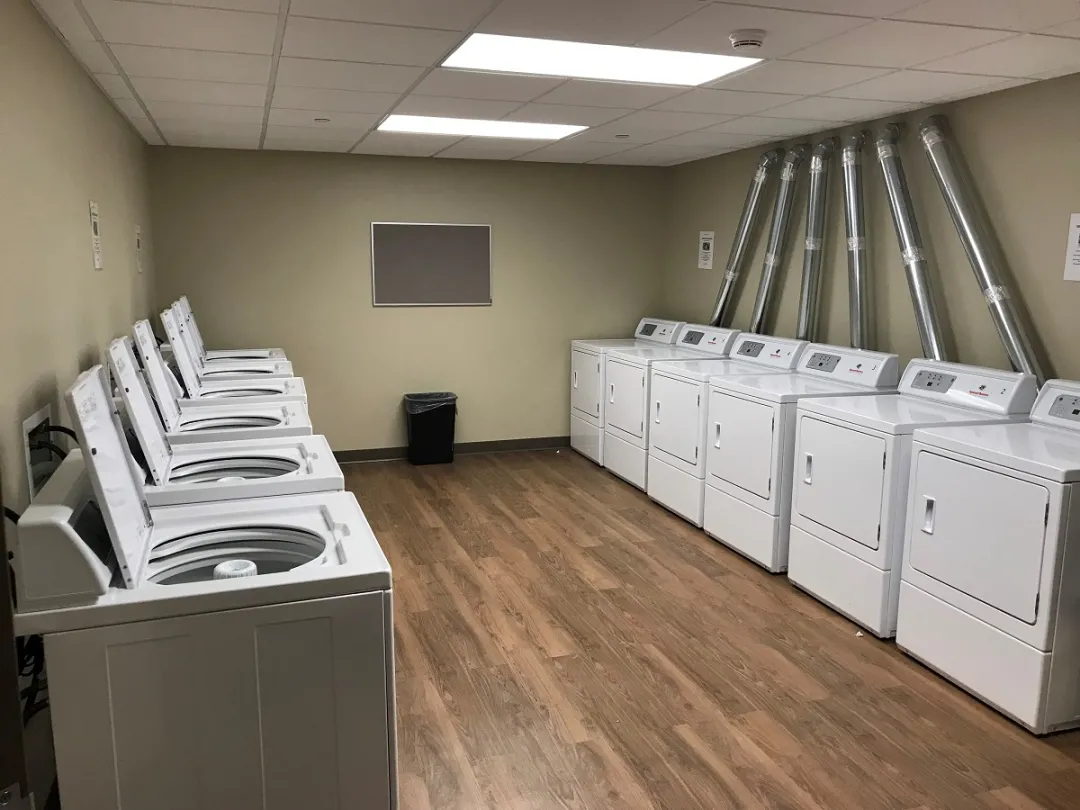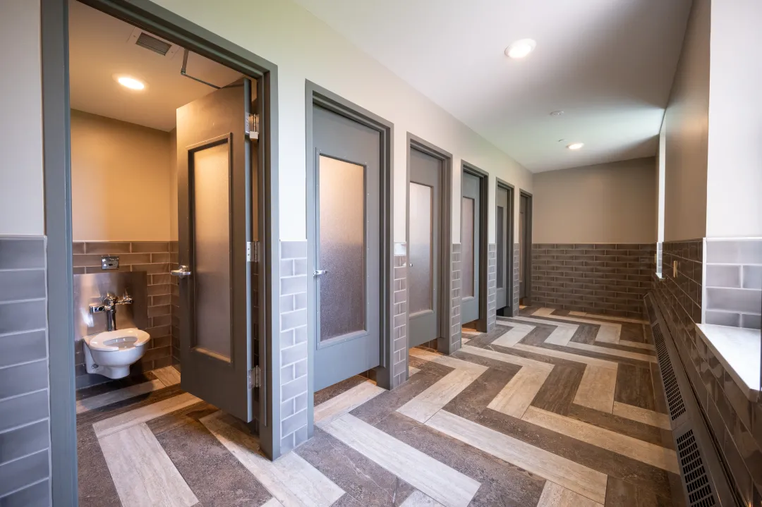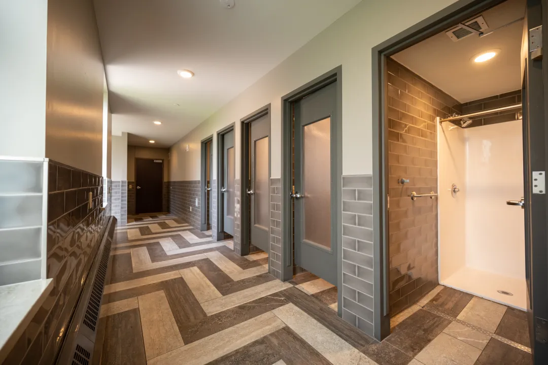 - Shared bathrooms with privatized bathroom stalls and showers on each wing of each floor; handicap accessible gender-neutral bathrooms on each wing of each floor