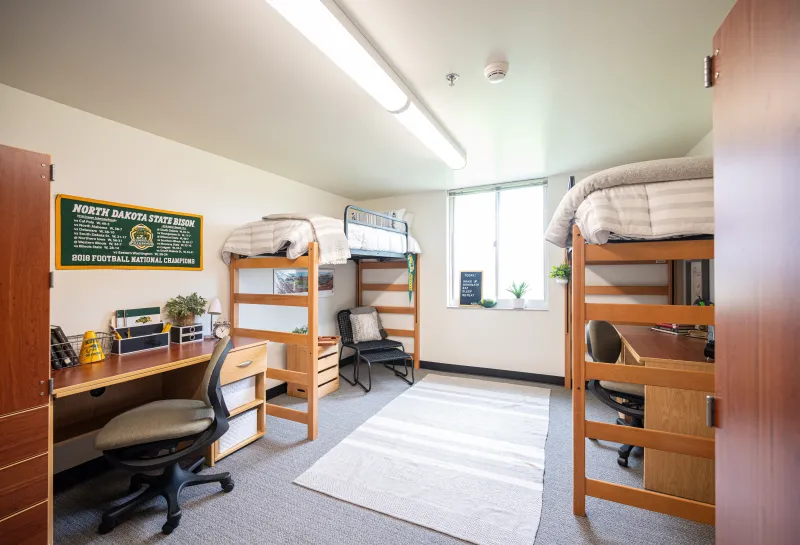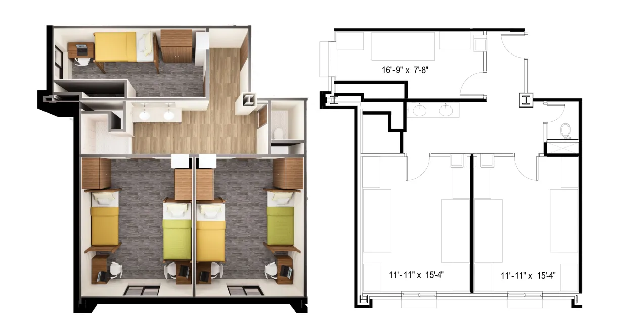 - 3-person suite: One double room, with one single room. Single room is reserved for the floor RA.