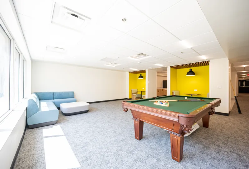 - Fully renovated basement with a large kitchen and an open-concept community space with lounge seating, study spaces, a large TV with gaming capability, and recreational equipment