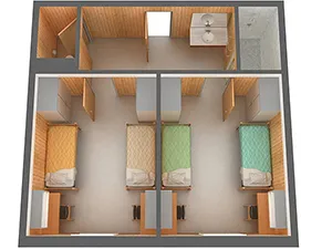 - Two double rooms share a common foyer with shower and toilet facilities (foyer cleaned every other week by custodial staff)