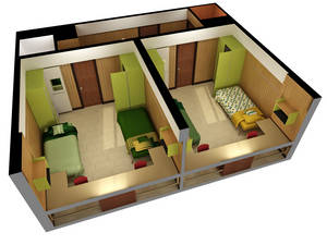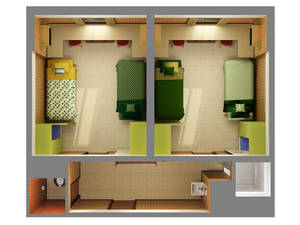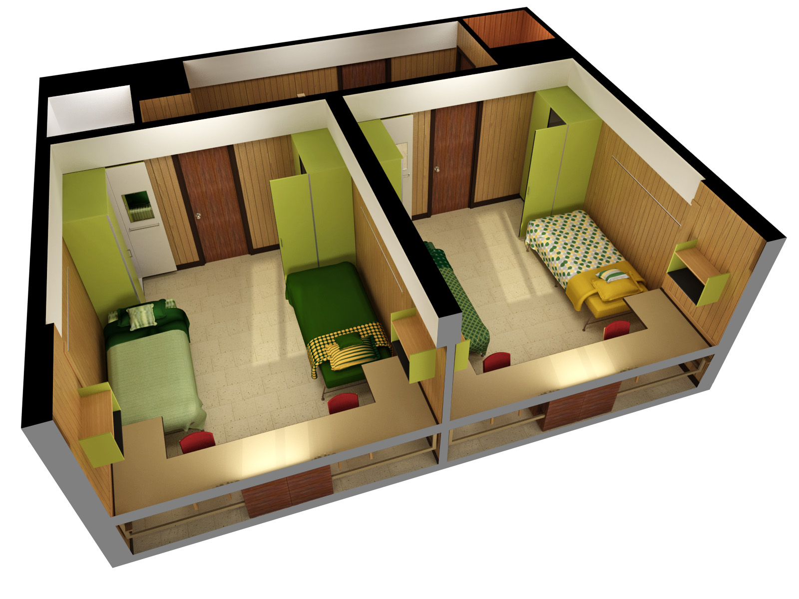 - Two double rooms share a common foyer with shower and toilet facilities (foyer cleaned regularly by custodial staff)